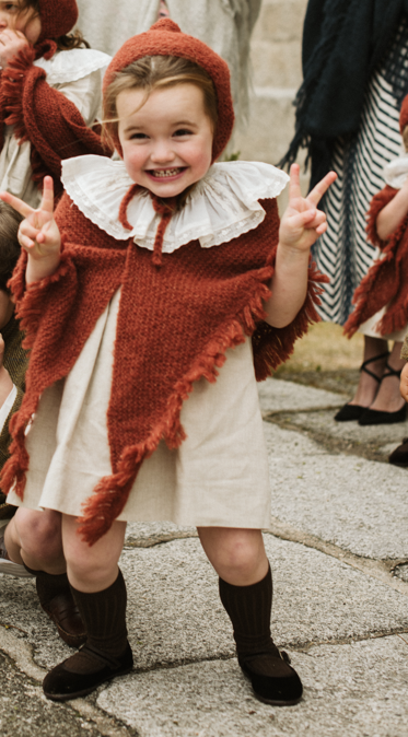 Tejidas completamente a mano, nuestras capas infantiles se confeccionan solo una vez realizado el pedido. Compuestas por una mezcla de 77 % alpaca y 23 % seda, pueden elegirse tanto la talla como el color que prefieras para personalizar la pieza. El plazo estimado de entrega es de 15-20 días desde la confirmación del pedido.